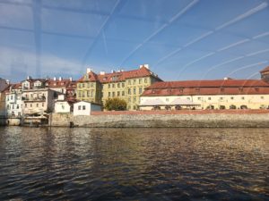 Kaarlensillalla piti riisua jo villatakit pois, aurinko lämmitti mukavasti. Päätimme täälläkin mennä jokiristeilylle tutustumaan kaupunkiin.  Laiva lähti Kaarlensillan juuresta, emmekä etukäteen huomanneet, että siinä oli muovikatos päällä, joten siellä tuli aika lämmin ja kuvat eivät onnistuneet. Muutama tässä kuitenkin malliksi. Lisäksi selostus tuli kaiuttimista melko epäselvänä ja taustamelua oli sen verran,  että emme saaneet selostuksesta juuri mitään irti. Onneksi tämä risteily kesti vain 50 minuuttia.