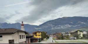 Ahtauduimme täyteen Innsbruckiin menevään junaan taas tyytyväisinä paikkalipuista. Jouduimme häätämään matkustajat meidän paikoiltamme pois, mutta heidän omat paikkansa olivatkin meitä vastapäätä ja he vuorostaan joutuivat häätämään siinä istuvat pois. Pariskunta, joka istui siinä meitä vastapäätä, oli Irakista kotoisin. He olivat menossa Innsbruckiin, johon tulivat myös heidän kaksi Wienissä asuvaa poikaansa. Keskustelimme elämästä Irakissa, sen kuumuudesta (jopa+70 C.), pitkään jatkuneesta sodasta ja sen takia vaikeasta tilanteesta. Mies kertoi olleensa helikopterilentäjänä sodassa lähes koko elämänsä ajan. Perheen tytär asuu Bagdadissa ja siellä on usein niin kuuma, ettei lapsia voi päästää ulos. Tämä pariskunta nauttii Itävallan raikkaasta ilmasta ja vihreydestä, jota ei heidän kotimaassaan ole.  Oli kyllä mielenkiintoiset keskustelut heidän kanssaan. Vajaan kahden tunnin matka Innsbruckiin meni nopeasti. Vuoristomaisemiakin ihailtiin. Ikkunan läpi tuli kuvatuksi runsaasti maisemakuvia.
