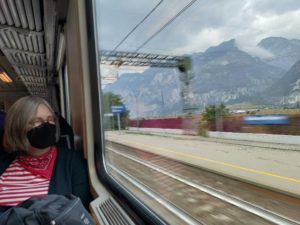Tämä juna oli vielä täydempi kuin edellinen ja taas jouduimme pyytämään kaksi nuorta naista siirtymään paikoiltamme. Vieressä istuvat kertoivat, että joku juna oli aiemmin peruttu ja siksi tämä oli niin täynnä. Meillä oli hyvät ikkunapaikat. Maisemat tulivat aina vain komeammiksi. Dolomiittien vuoret olivat korkeita ja jylhiä, pieniä kyliä vuorten juurilla, ruskan värejä puissa.